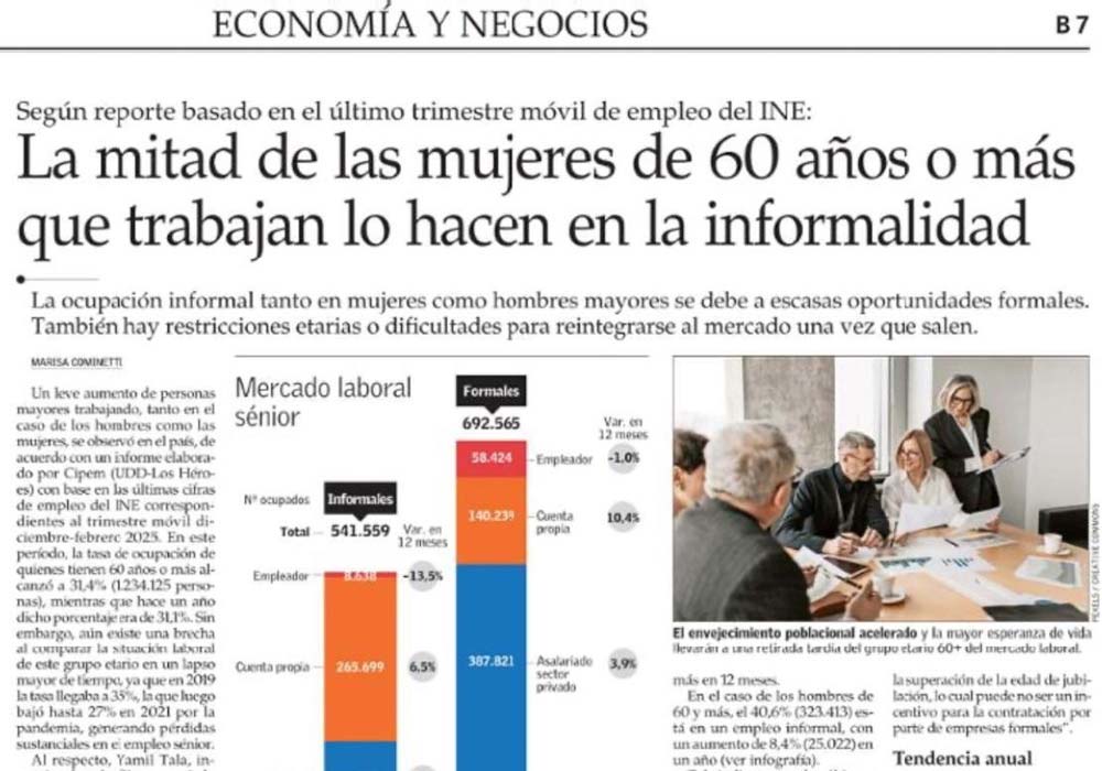 Yamil Tala El investigador asistente Yamil Tala fue citado en el cuerpo Economía y Negocios de El Mercurio el martes 23 de abril de 2025, en un artículo que aborda la alta tasa de informalidad laboral entre personas mayores de 60 años en Chile, especialmente en mujeres. La publicación se basa en un análisis del último trimestre móvil de empleo del INE y destaca que el 43,9% de los trabajadores sénior se desempeñan en condiciones informales.